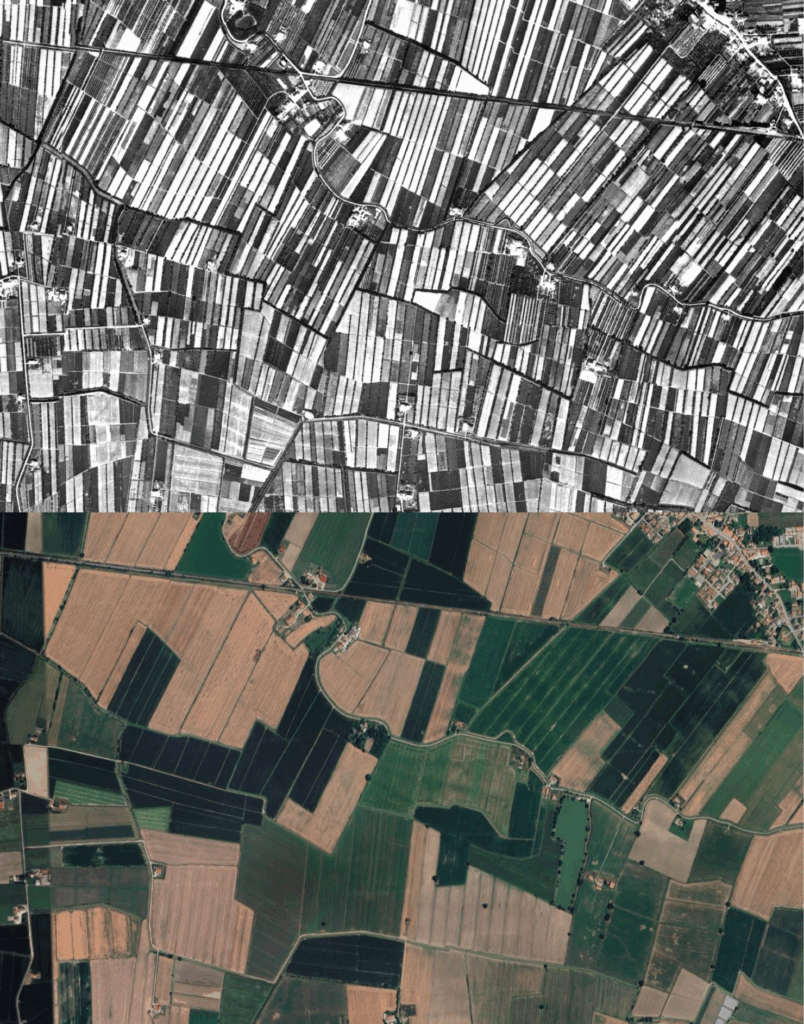 Esempio della trasformazione radicale avvenuta in Pianura Padana negli ultimi 70 anni. In alto, situazione nel 1954, paesaggio rurale dominato da sistemi agroforestrali. In basso, situazione attuale (immagine satellitare del 2024) che mostra la quasi totale scomparsa di Coltura Promiscua, sostituita da monocolture intensive