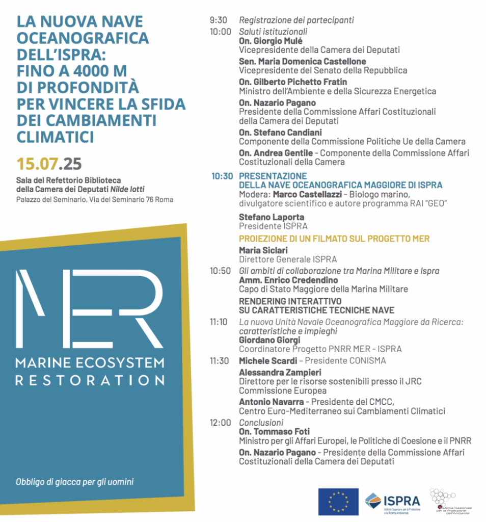 Questa nave, frutto del progetto Marine Ecosystem Restoration (MER), rappresenta uno degli assi portanti del PNRR (Piano Nazionale di Ripresa e Resilienza) per l’ambiente marino: 400milioni di euro stanziati per proteggere e ripristinare ecosistemi fragili, a partire da quelli sommersi, invisibili, spesso dimenticati.