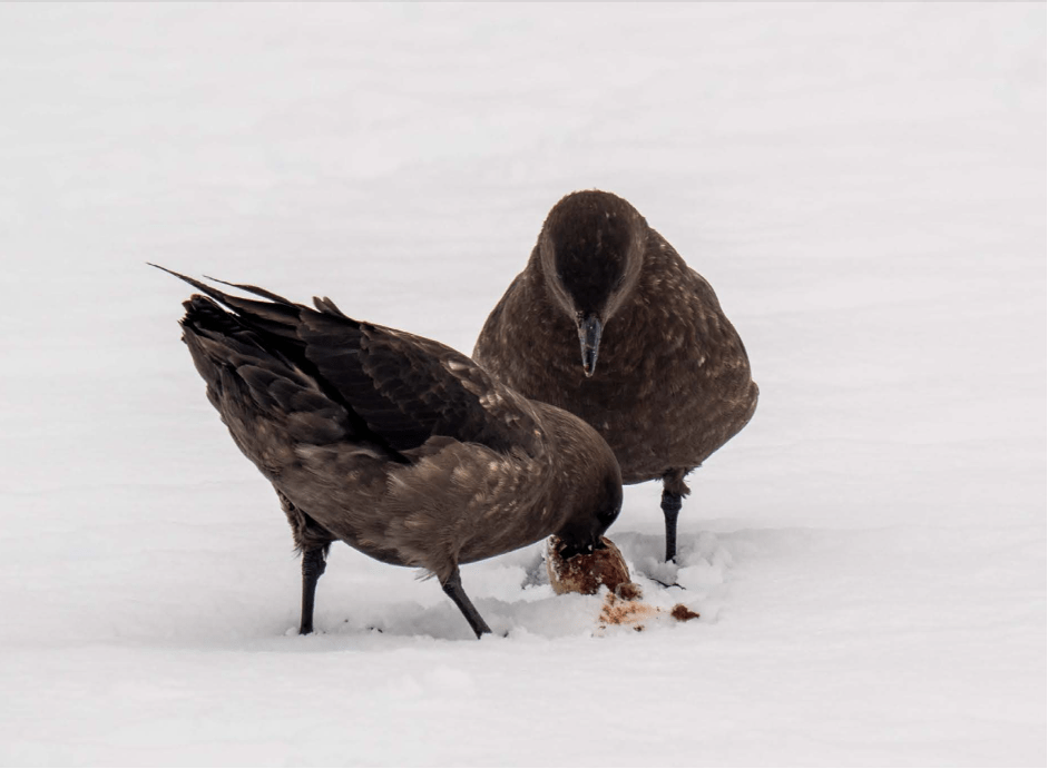 Insieme con i giant petrels, anche gli skua (in particolare lo skua antartico, Stercorarius maccormicki) hanno iniziato ad accompagnare la nave. Gli skua sono uccelli estremamente intelligenti e opportunisti, noti per il loro comportamento territoriale e per la capacità di adattarsi a diverse fonti di cibo.