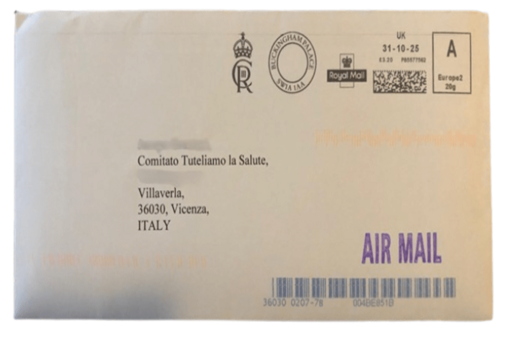 L’interesse di Sua Maestà per questa terra si è rinnovato con una lettera su carta intestata di Buckingham Palace, recapitata da Londra a Villaverla e ricevuta da un referente del Comitato Tuteliamo la Salute. Il documento, corredato dallo stemma reale, è stato indirizzato direttamente al Comitato, che ne ha diffuso il contenuto.